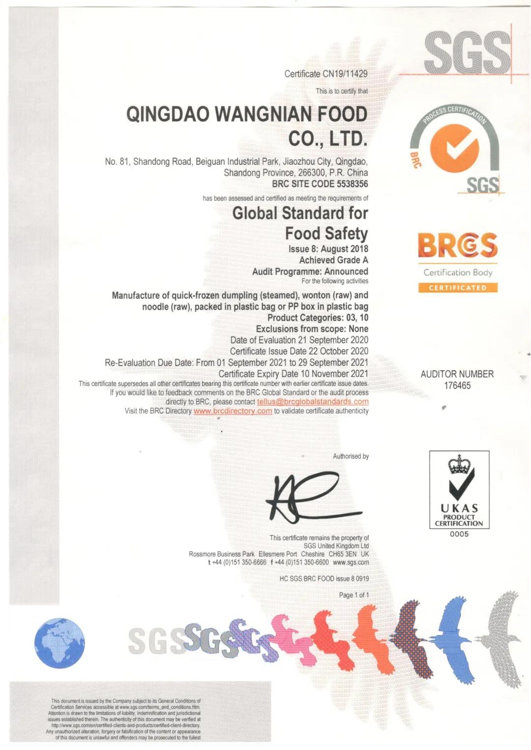 青島旺年食品有限公司BRC認證A級證書